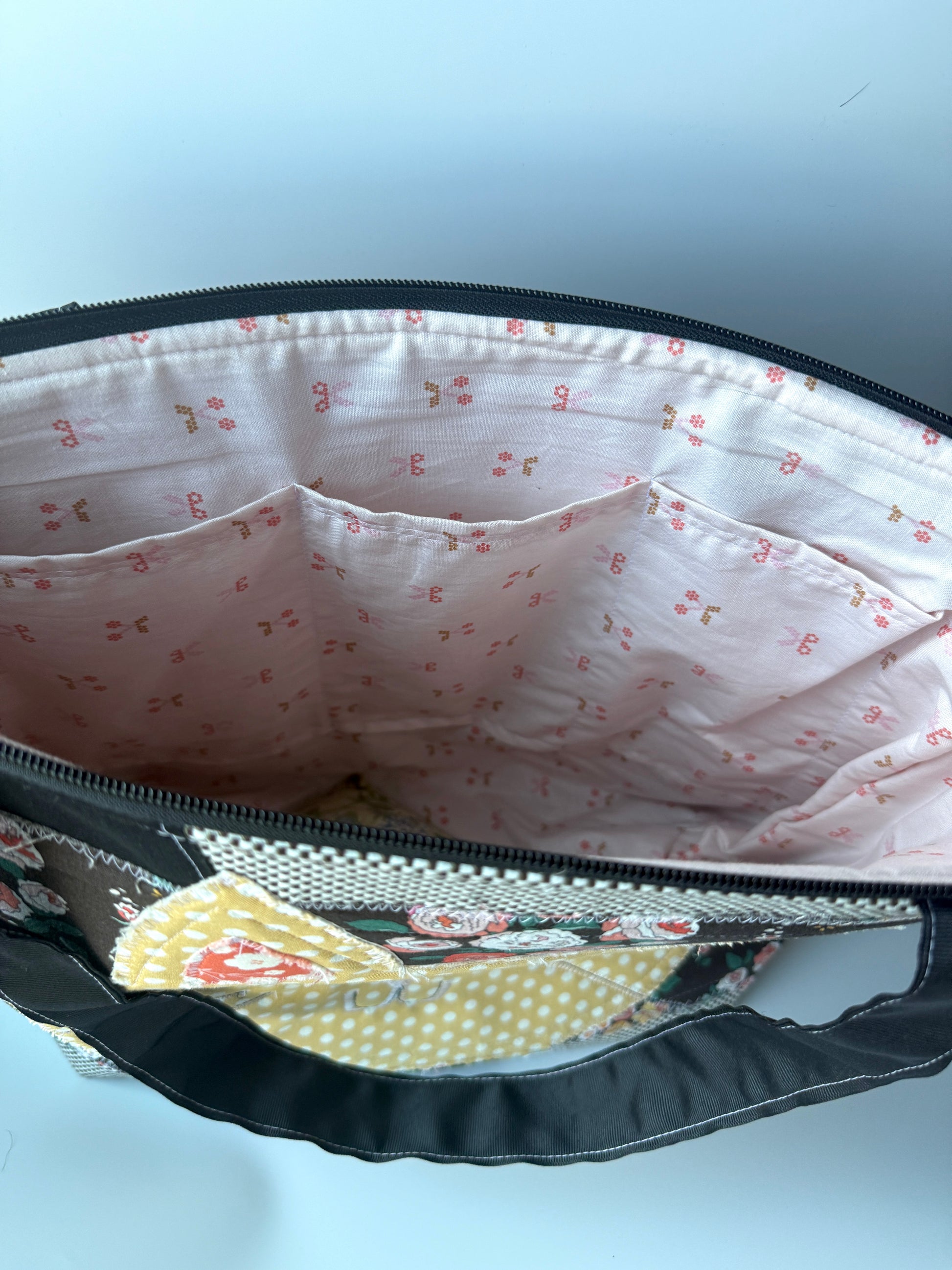Each bag is made to order. Exact fabric placement, eye buttons as well as fabric pattern for lining and back pocket may vary. If there is something you love about this bag-leave it in the comments